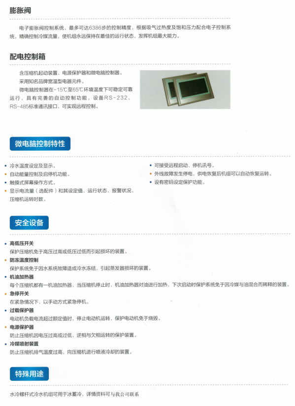 ①機組所用制冷系統配件全部選用名牌廠家的產品,如可拆式干燥過濾器、外平衡式熱力膨脹閥、供液電磁閥、視液鏡、高、低壓力控制器、排氣溫度控制器等均采用世界一流的名牌廠家的產品,確保機組具有較高的性能水平。